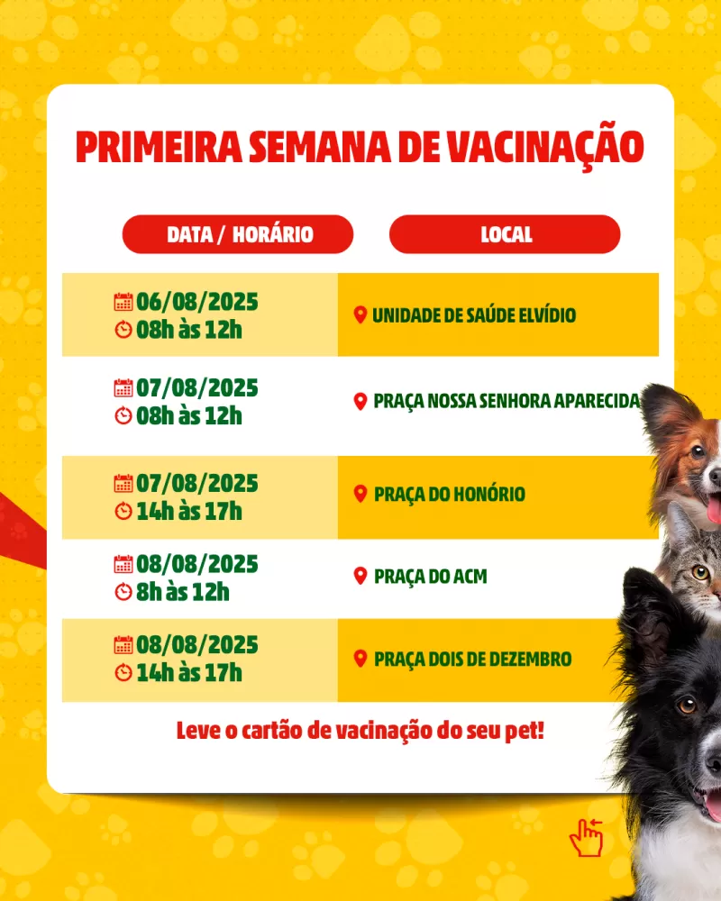 Os donos de cães e gatos devem comparecer até um ponto de vacinação mais próximo e não esquecer o cartão de vacinação do seu melhor amigo. Vacinar é um gesto de responsabilidade e cuidado com a vida.